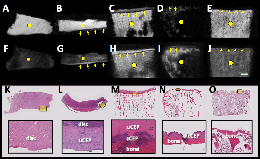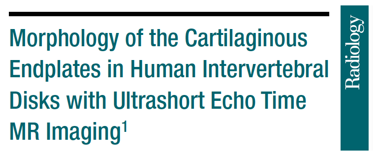 Cartilaginous endplates form an interface between intervertebral discs and vertebral body of the spine, and serves important functions for proper nutrition and biomechanical stability of the spine. This important tissue was previously not observable using traditional MR techniques. Evaluation of cartilagious endplates may one day help to better assess conditions related to low back pain.