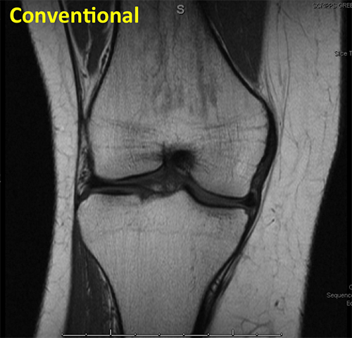 This conventional MRI of a knee shows articular cartilage and menisci with medium to low signal intensity.