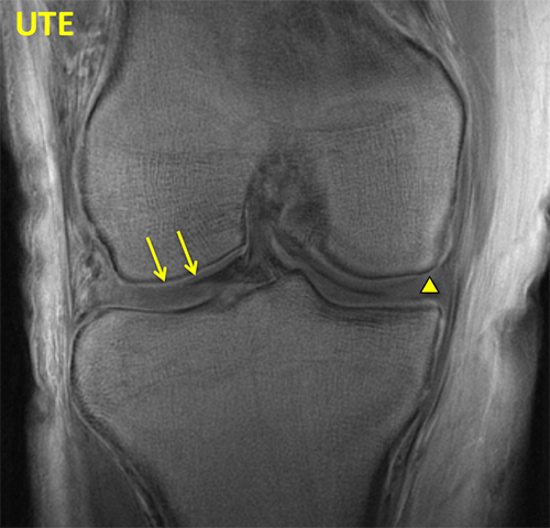 UTE MRI reveals deep and calcified layers of articular cartilage (arrows) and menisci (triangle) with high signal intensity.
