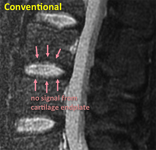 This conventional MRI of a spine shows cartilage endplates with low signal intensity, making it difficult to evaluate them.