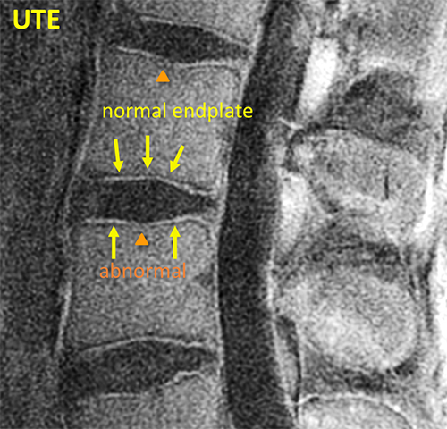 UTE MRI reveals the structure of cartilage endplates with high contrast. Both normal and abnormal structures could be discerned here.