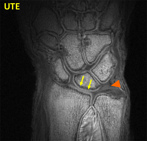 UTE sequence of the wrist shows bright signal in the deep and calcified layer of cartilage (arrow) and in the triangular fibrocartilage (arrowhead) (TFC).