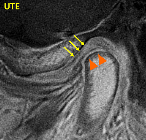 UTE sequence of the TMJ shows bright signal in the disc (arrows) and in the fibrocartilage covering the mandibular condyle (arrowhead).