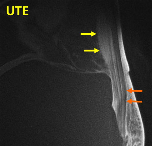 UTE sequence of the ankle shows normal fasciculation (white arrow) in the tendon and a region of tendinosis (orange arrow) that could not be seen on the standard MRI.