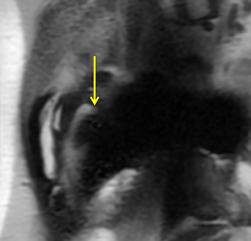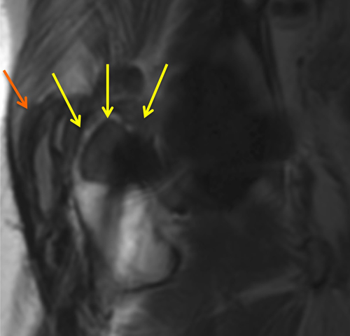 In conventional T2-weighted image, metal artifact obscures osteolysis (yellow arrows).