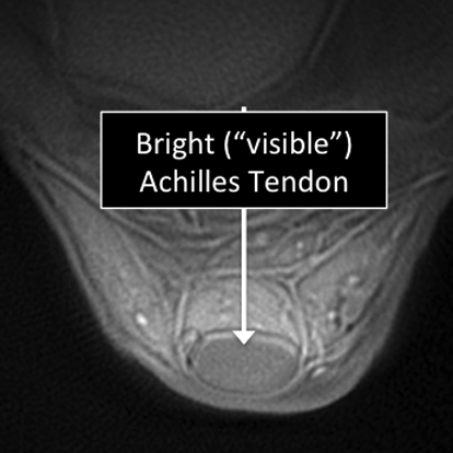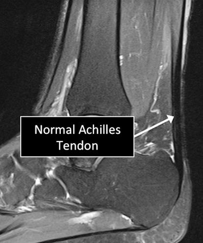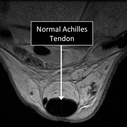 Ankle MRI examinations showing normal (top) and abnormal (bottom) Achilles tendon.