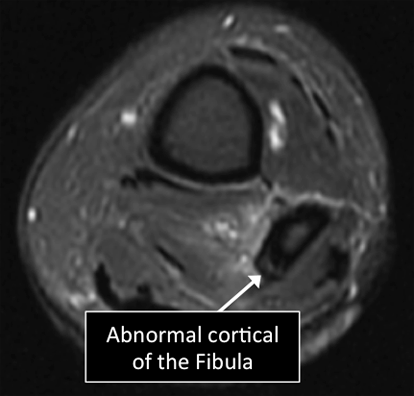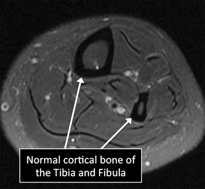 Leg MRI examinations showing normal (top) and abnormal (bottom) cortical bone.