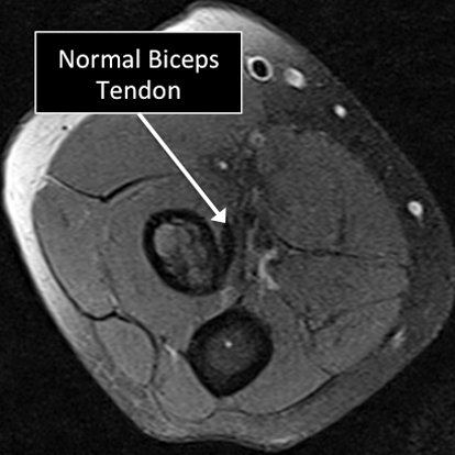 Elbow MRI examinations showing normal (top) and abnormal (bottom) biceps tendon.