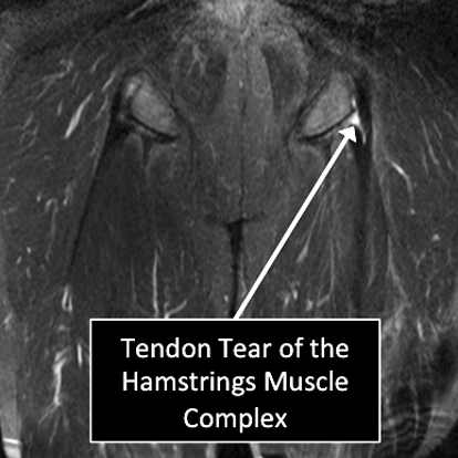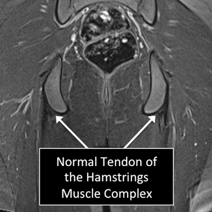 Hip MRI examinations showing normal (top) and abnormal (bottom) tendon of the Hamstrings Muscle Complex.