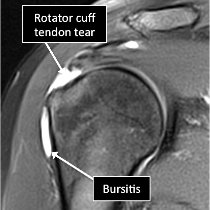 MRI examinations showing normal shoulder (top) and a rotator cuff tear and bursitis (bottom).