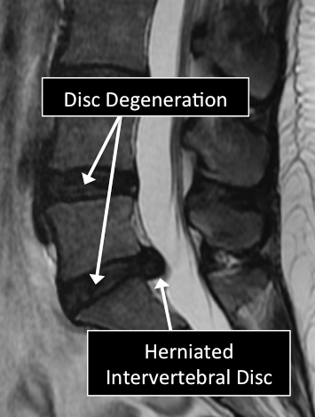 MRI examinations showing normal (top) and abnormal (bottom) lumbar spine.