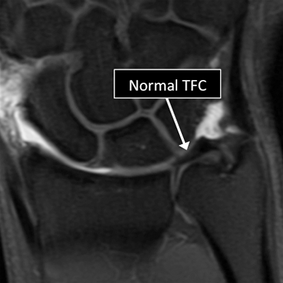 Wrist MRI examinations showing normal (top) and abnormal (bottom) TFC.